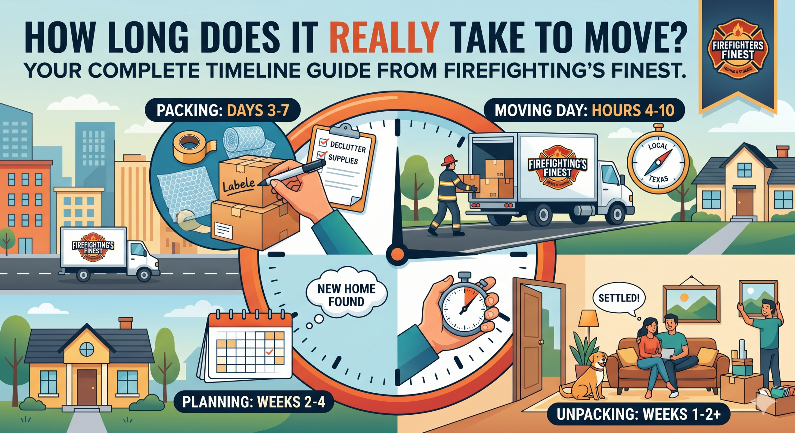 If there is one question we hear more than any other at Firefighting’s Finest Moving & Storage, it’s: “How long is this going to take?” Moving often feels overwhelming, but having a realistic timeline makes the entire process manageable. The truth is, the time it takes to move depends heavily on your preparation, the size of your home, and the distance you are traveling.
