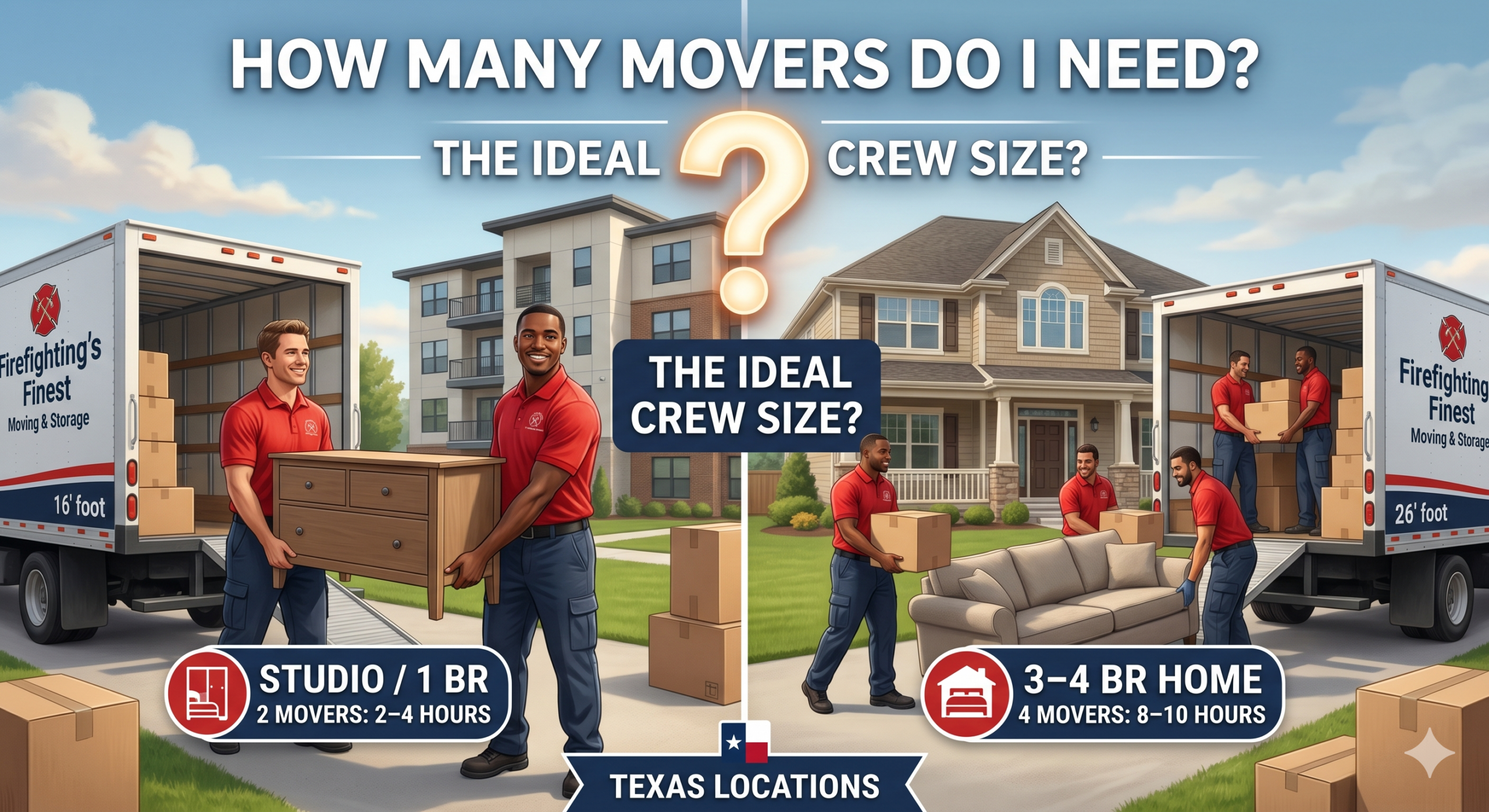 One of the most common questions we get here at Firefighting’s Finest Moving & Storage is: “How many movers do I actually need?” It’s a crucial question. Hire too few movers, and the job could take forever, leading to fatigue and a stressful moving day. Hire too many, and you risk overpaying for hands you don’t need. With over 25 years of experience moving families and businesses across Fort Worth, Dallas, Houston, and Austin, our off-duty firefighters and professional movers know exactly how to strike the perfect balance.